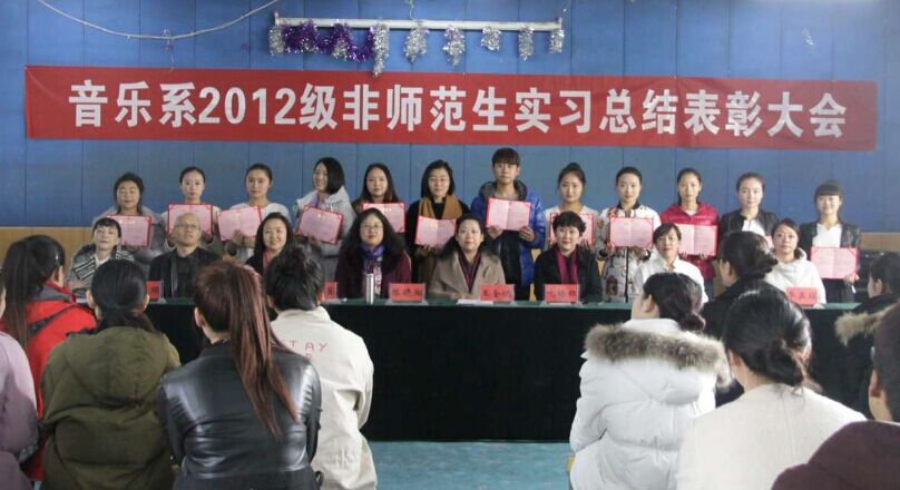 伟德国际victor1946于11月23日早10:00点,在艺术楼多功能厅召开了2012级非师范生实习活动总结表彰大会,会议由办公室主任宋睿青主持。党总支书记陈晓翔、副主任王金锐、张连葵以及我系2012级非师范专业全体员工参加了此次会议。