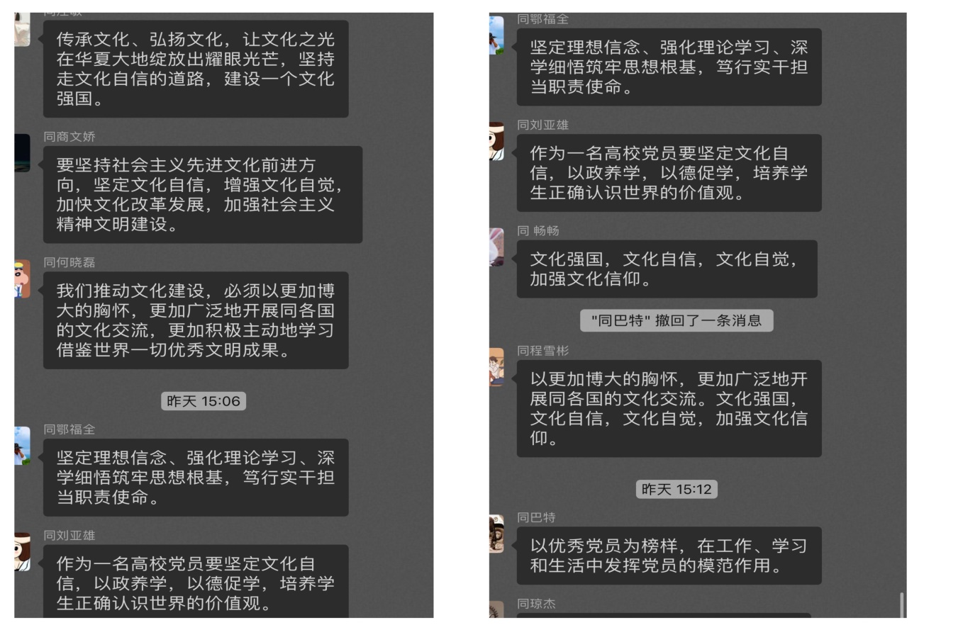 活动的最后,党员同志们紧紧围绕“坚定文化自信,建设文化强国”进行交流研讨发言,纷纷表示,通过学习,我们要坚定文化自信,建设文化强国。因此,学习重在落实。作为教育工作者在深入学习党的二十大精神,深入开展学习贯彻习近平新时代中国特色社会主义思想主题教育的同时,也要深入研究落实教育工作者在新时代、新征程的使命和任务,为全面建设社会主义现代化国家贡献力量。