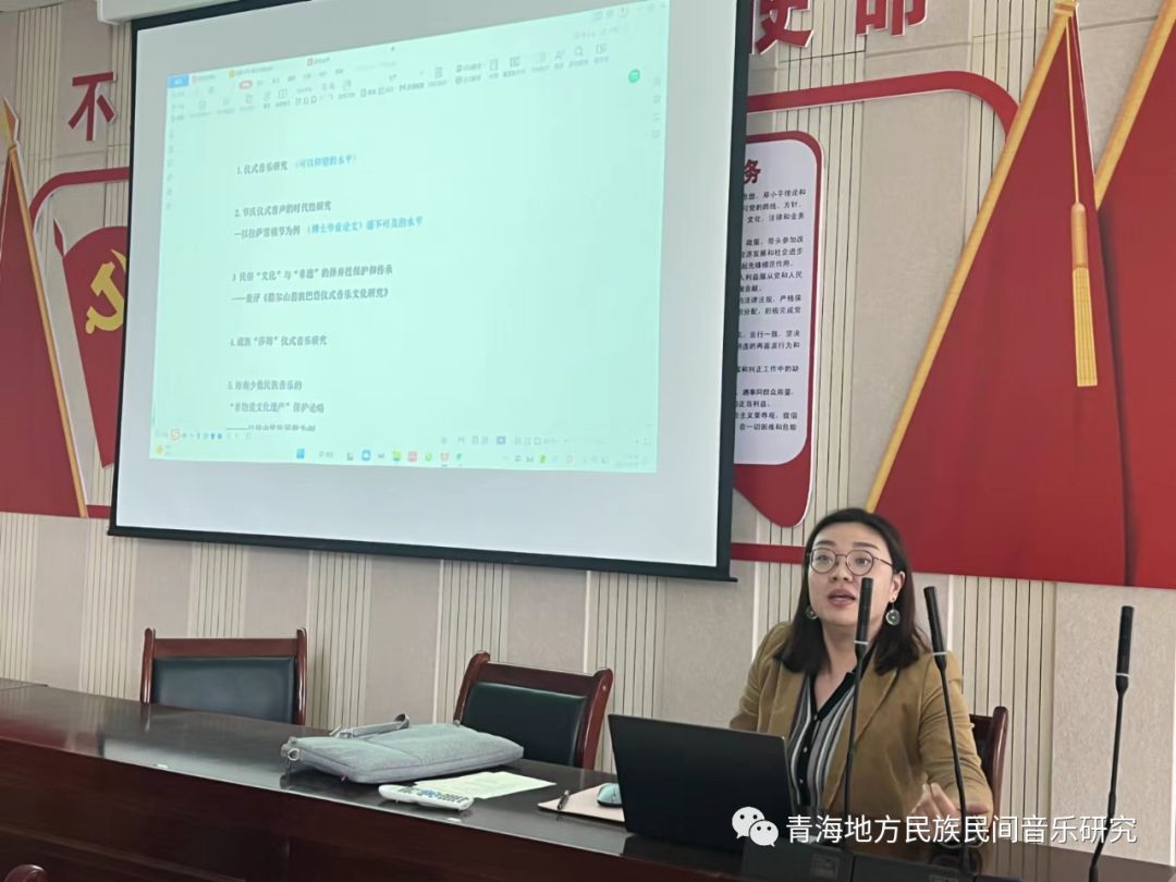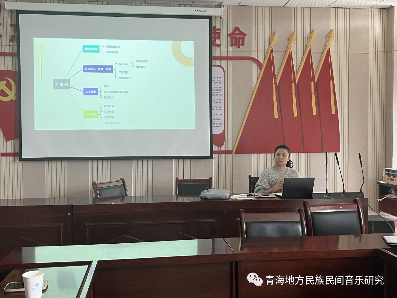本次阅读分享分别是尹静和程雪彬两位老师分享了自己阅读的收获及感想。尹静老师制作了精美PPT分别介绍了撒拉族、藏族、彝族三个民族的仪式音乐,介绍内容细致详实,以多维度,多视角进行比较研究,总结我国多民族音乐构成“和而不同”的生态特点。程雪彬老师分享了她对当前青海地方区域音乐体裁“花儿”相关研究成果的认识,分享如何通过阅读在相关领域得到学术启发,程老师从多视角观察研究对象分享了个人感悟,实用性很强。